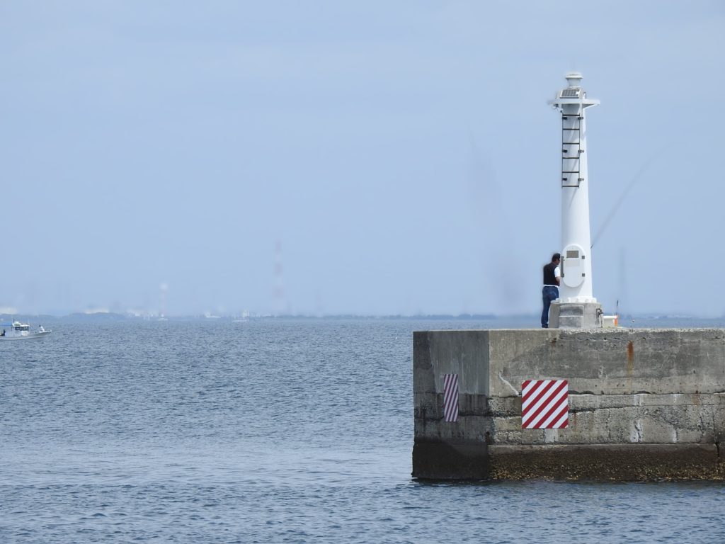 灯台は陸から離れた防波堤の上に立っています。