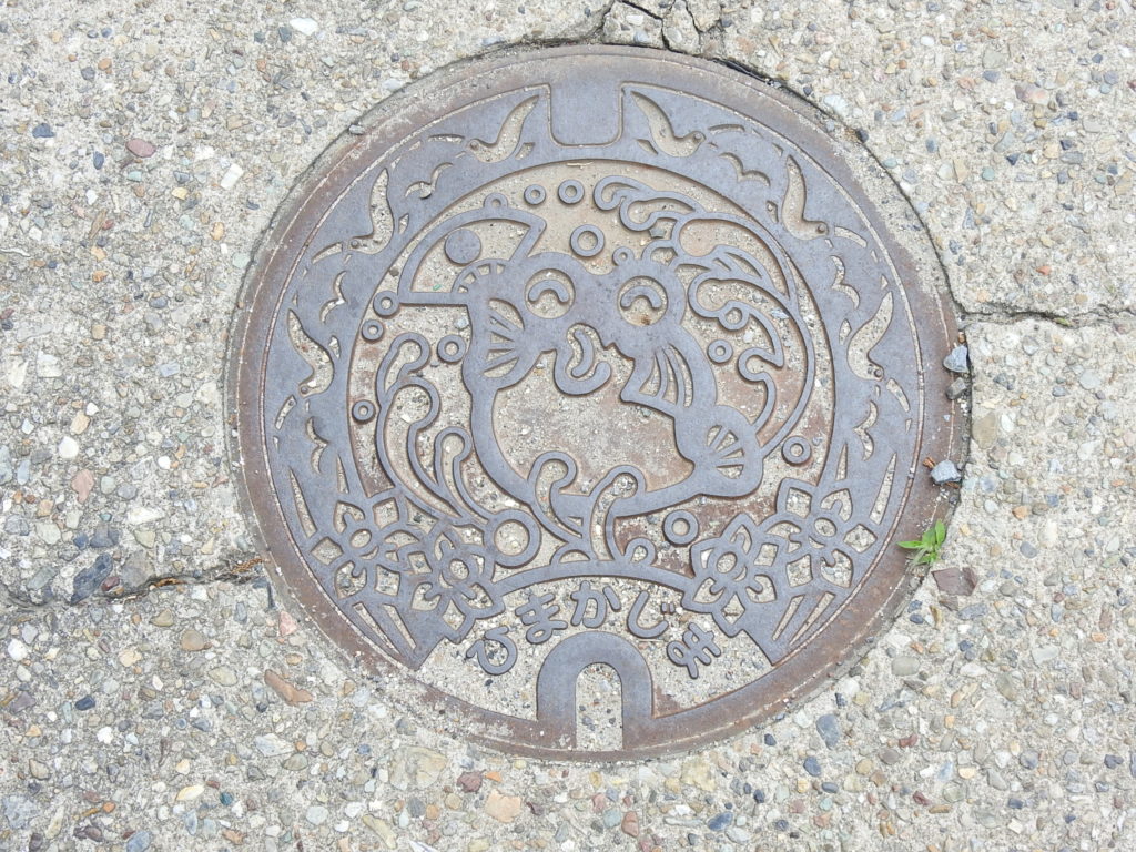 足元のマンホールの蓋には「たこ」と「ふぐ」のデザインが施されています。