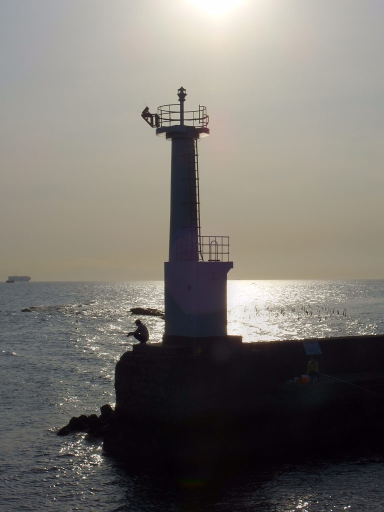 灯台と釣り人がシルエットになるように撮れていました。