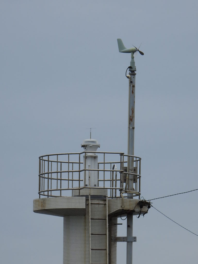 ひときわ高く風力計があります。この機器で風向と風力を測定し「波ケ埼灯台 気象情報」として最新12時間の情報をリアルタイムに提供しています。・・・そー言う機器類の電力も賄うために商用電源を使用しているのかも?