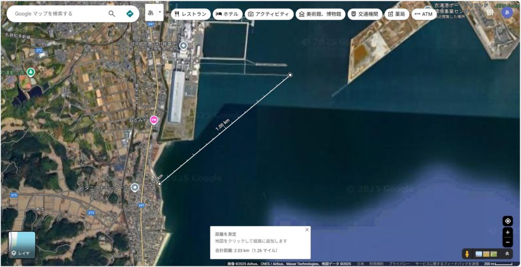 どこか歩いて行ける場所はないかとGoogleマップを見つつ、JERA 武豊火力発電所の西側の道に沿って探してみましたが、細い川や、陸続きの場所は上部が有刺鉄線付のフェンスでしっかりブロック。